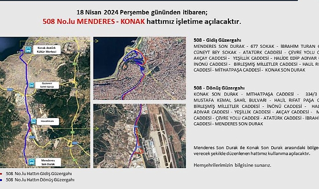 İzmir Büyükşehir Belediyesi Ulaşım Koordinasyon Merkezi (UKOME) Genel Kurulu’nda onaylanan karar gereğince; mavişehir aktarma Merkezi-Konak (121) ve Menderes – Konak (508) otobüs hatları, 18 Nisan Perşembe gününden itibaren yeniden hizmet vermeye başlayacak.
