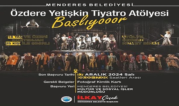 Menderes Belediyesi Özdere Yetişkin Tiyatro Atölyesi, tiyatroya ilgi duyan 18 yaş üstü vatandaşları bekliyor. Devam eden başvurular 17 Aralık Salı günü saat 17:00’da sona eriyor. Vatandaşların, fotoğraf ve kimlik kartları ile birlikte 09:00-17:00 saatleri içerisinde menderes Belediyesi Kültür ve Sosyal İşler Müdürlüğü veya Özdere Hizmet Binası’na gelerek form doldurması gerekiyor. Kontenjanın 25 kişi olduğu ve hızla dolduğu belirtildi.